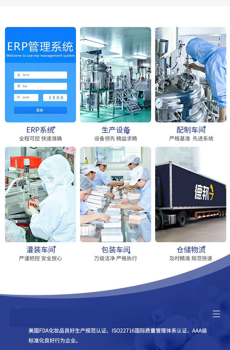 scxkyqwayzas2asz.jpg公司廠區環境優美,廠房面積超10000平方米,生產車間環境完全按照GMPC認證所需要的條件建設,并一次性通過 “GMPC”認證。公司目前擁有多條現代化的生產線,多臺/套國際、國內先進乳化、自動灌裝、滅菌、檢驗檢測等儀器,具備各類膏霜、洗護、美容化妝產品的生產條件和能力,年生產能力可達到數千萬支,同時工廠不僅能生產各種形態、規格、品種的化妝品,還能提供化妝品所有常規檢驗項目的檢測報務,全方位保證企業的產品在消費者手中的安全使用,讓消費者放心消費。 工廠自投產以來,嚴格按國家各項政策、法規實施經營管理,積極進取,求實創新。嚴格執行質量體系的同時按GMPC要求組織日常全過程生產,使每一支驗收合格的產品,在市場上讓不同地區的消費者滿意,從而讓企業贏得更多消費者的青睞...